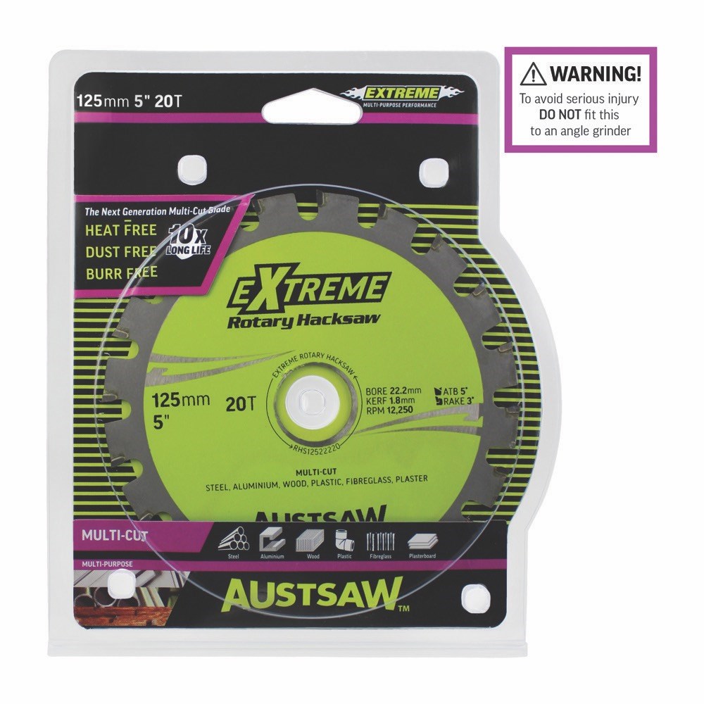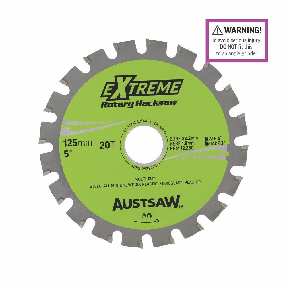 The Austsaw Rotary Hacksaw cutting blade is made with a hardened tempered body for clean, smooth cuts (fast and smooth cutting action). Titanium carbide teeth provide longer life when metal cutting, and a high-raised shoulder provides maximum strength behind each tip. Purchase the Austsaw Rotary Hacksaw circular saw blade and you will experience extreme cutting performance!