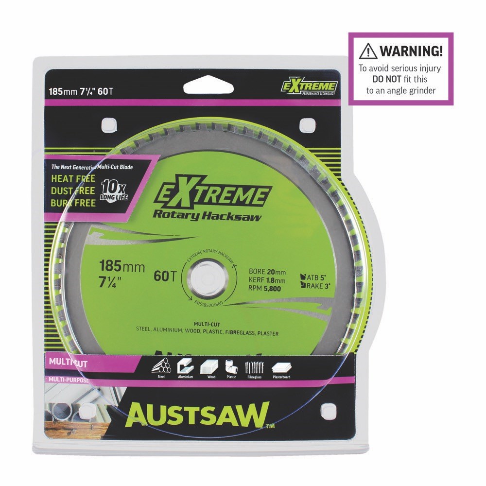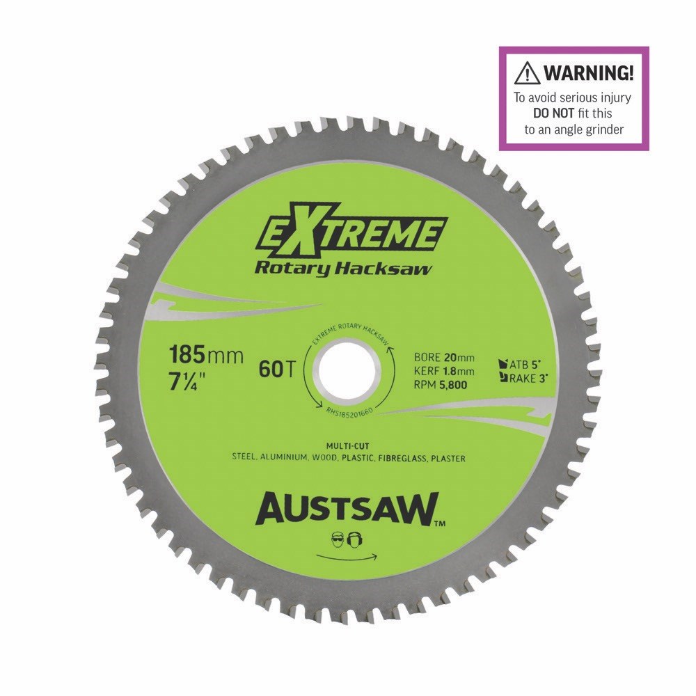 The Austsaw Rotary Hacksaw cutting blade is made with a hardened tempered body for clean, smooth cuts (fast and smooth cutting action). Titanium carbide teeth provide longer life when metal cutting, and a high-raised shoulder provides maximum strength behind each tip. Purchase the Austsaw Rotary Hacksaw circular saw blade and you will experience extreme cutting performance!