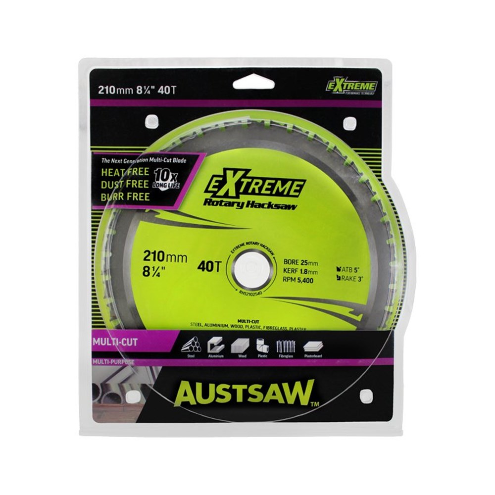 The Austsaw Rotary Hacksaw cutting blade is made with a hardened tempered body for clean, smooth cuts (fast and smooth cutting action). Titanium carbide teeth provide longer life when metal cutting, and a high-raised shoulder provides maximum strength behind each tip. Purchase the Austsaw Rotary Hacksaw circular saw blade and you will experience extreme cutting performance!