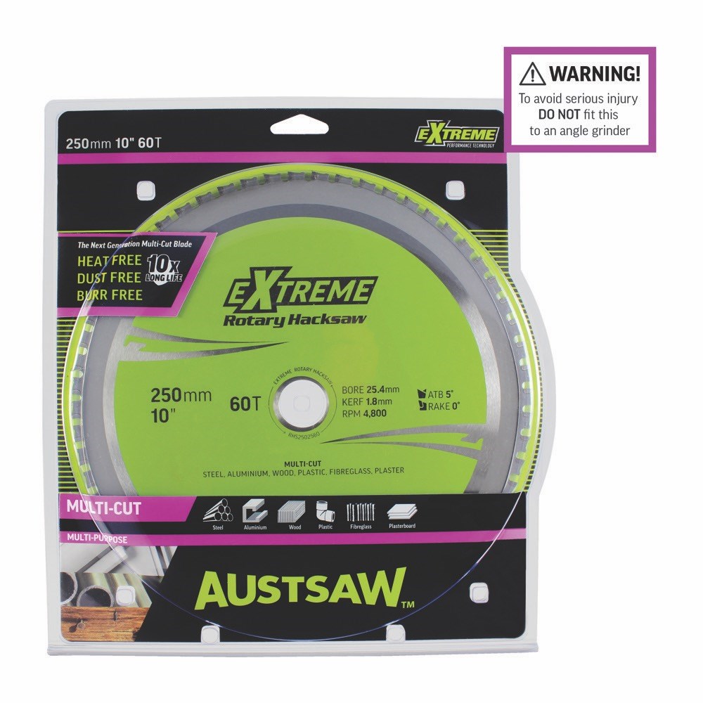 The Austsaw Rotary Hacksaw cutting blade is made with a hardened tempered body for clean, smooth cuts (fast and smooth cutting action). Titanium carbide teeth provide longer life when metal cutting, and a high-raised shoulder provides maximum strength behind each tip. Purchase the Austsaw Rotary Hacksaw circular saw blade and you will experience extreme cutting performance!