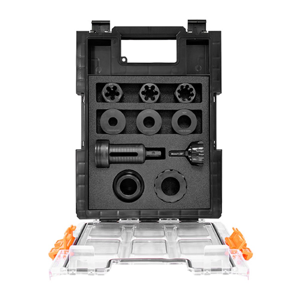 Set Contains: ImpactaDie XL Holder, XL Guide Collar, XL Flush Collar, 5/8, 3/4, 7/8, 1" Guides, 5/8, 3/4, 7/8, 1" Hex Die Nuts & ImpactaBurr Chamfer Tool 1-7/16"