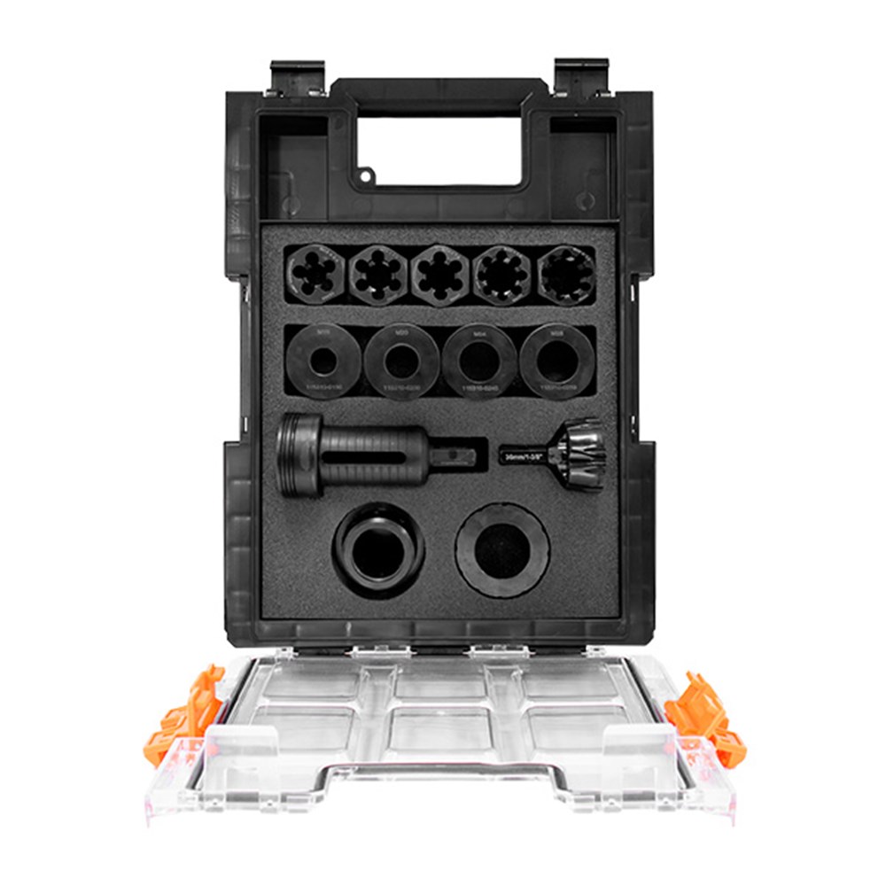 Set Contains: ImpactaDie XL Holder, XL Guide Collar, XL Flush Collar, M16/20/24/25 Guides, M16/20/24 Metric Hex Die Nuts, M16/20/25 Metric Fine Hex Die Nuts & ImpactaBurr Chamfer Tool 36mm