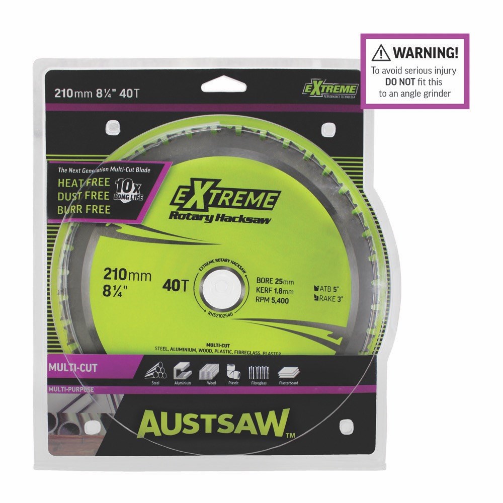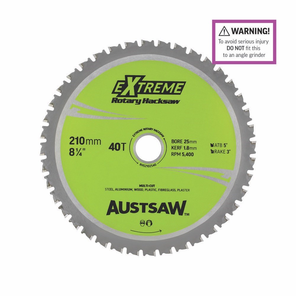 The Austsaw Rotary Hacksaw cutting blade is made with a hardened tempered body for clean, smooth cuts (fast and smooth cutting action). Titanium carbide teeth provide longer life when metal cutting, and a high-raised shoulder provides maximum strength behind each tip. Purchase the Austsaw Rotary Hacksaw circular saw blade and you will experience extreme cutting performance!